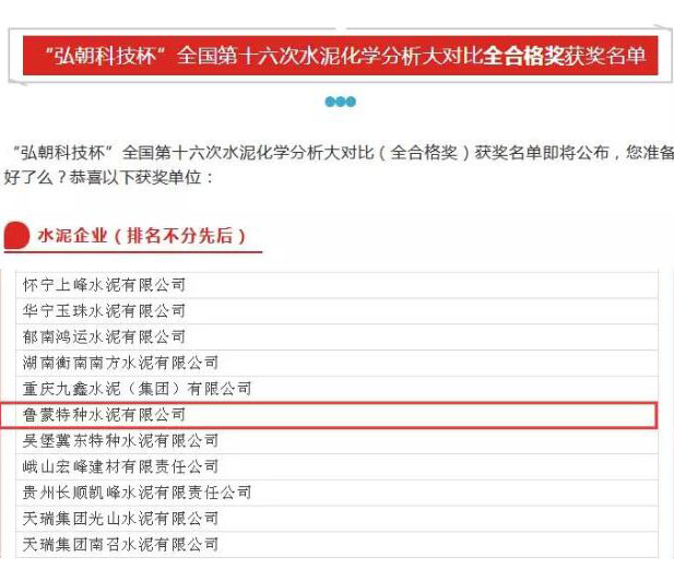 鲁蒙水泥荣获全国第十六次化学分析大对比“全合格”奖项